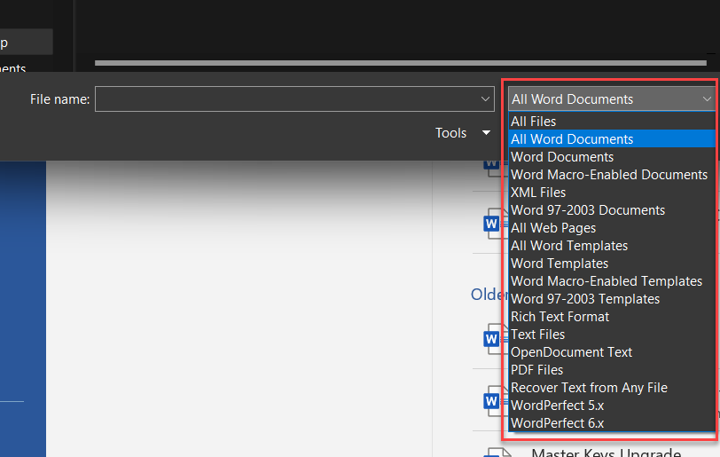 Here's an example from Microsoft Word, when I am opening a file, I would only see files with relevant extension. Of course if I want to see everything, I can always select "All Files".